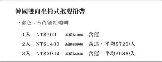 | 韓國雙向坐椅式抱嬰揹帶-體諒天下父母,減輕長時間抱著嬰幼兒的疲勞,座椅式抱嬰揹帶,輕鬆抱著小寶貝出門,寶寶坐得舒服您也放心!平均每入最低只要683元起(含運)即可購得韓國雙向坐椅式抱嬰揹帶1入/2入/ 售價:683 我要購買 |
