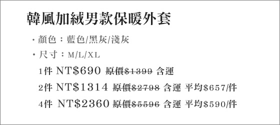 我要購買 假兩件修身羽絨棉保暖外套-修身假兩件外套,溫暖禦寒的完美之作!羽絨綿材質更舒適,3D立體剪裁與精細針腳,多色詮釋時尚LOOK平均每件最低只要607元起(含運)即可購得假兩件修身羽絨棉保暖外套1件/2件 |