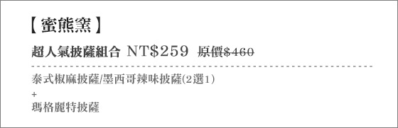 | 蜜熊窯-超人氣披薩組合-現場手工窯烤,充滿溫度的PIZZA饗宴!用料紮實、親擀餅皮,一點一點堆砌味蕾的驚喜,入口牽絲超過癮!只要259元即可享用【蜜熊窯】原價460元超人氣披薩組合:泰式椒麻披薩/墨西 售價:259 我要購買 |