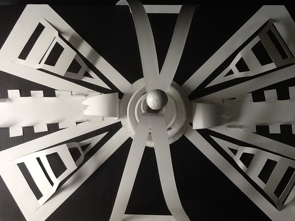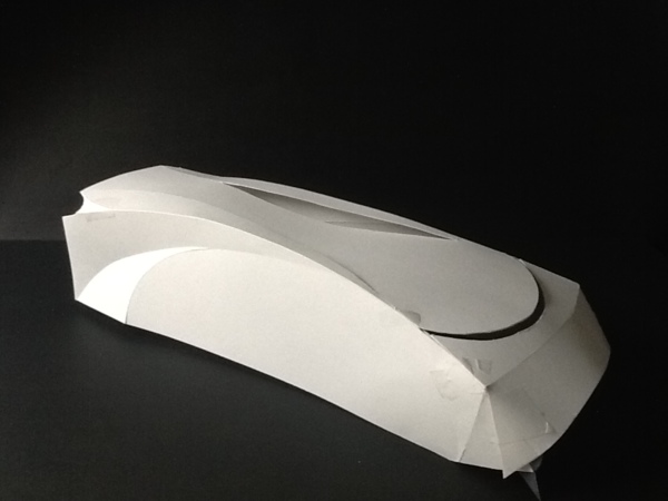 第二項作品是用紙(一樣是用較硬的白色卡紙)割加上黏貼做出一個交通工具
