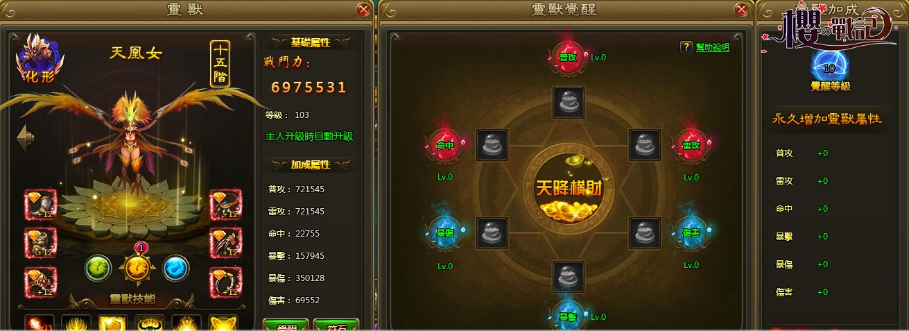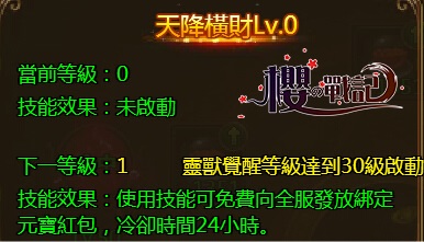 除此之外,靈獸覺醒後會有6種外圍節點,分別對應「普攻」、「火攻」、「命中」、「暴擊」、「暴傷」及「傷害」,當每個節點均達Lv10時,覺醒等級就為Lv10,且之後每10級還可獲得更多額外屬性加成!當覺醒等級達Lv30時就會啟動新技能「天降橫財」,進行發紅包喔!
