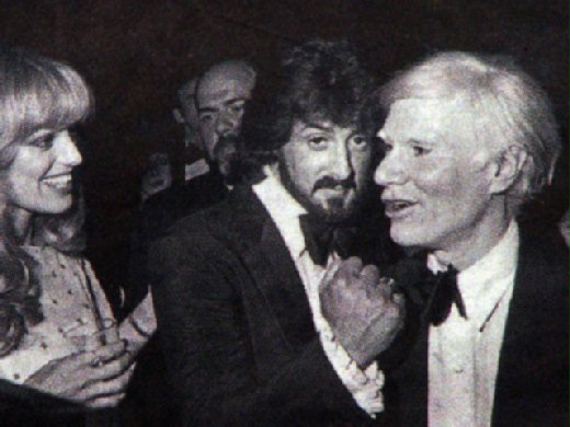 這張照片是攝影師龍卡雷拉在 1979年拍的, 他站在安迪沃赫旁邊, 感覺上不像合照, 倒像是當攝影師拿出相機時, 他賊賊地擠過去, 擋住後面鬍子先生的半張臉, 靦腆中還不忘擺出握拳的姿勢…。這一年, 他的洛基第二集推出, 藍波的第一滴血還得等三年後才會在世人面前流淌。