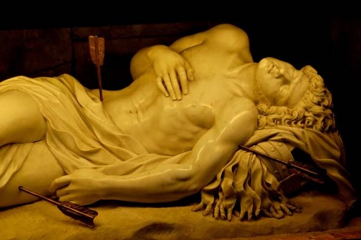 西元初始沒多久, 有一位官拜獄卒的公職人員, 因為經常安慰牢中的思想犯 (比較準確的說法是宗教思想犯), 或許也犯了類似「辛德勒」的人道缺失, 東窗事發之後被處以箭刑, 沒死, 復原之後再跑回去跟羅馬皇帝抒發己志, 就死了。多年後被封為聖人, 羅馬近郊有一棟專門紀念他的教堂, 在旅遊中心可以詢問前往朝聖的公共交通方式。他的名字是聖巴斯提亞諾 Sebastiano (參照各國發音, 以義大利原音最為筆者青睞…)。