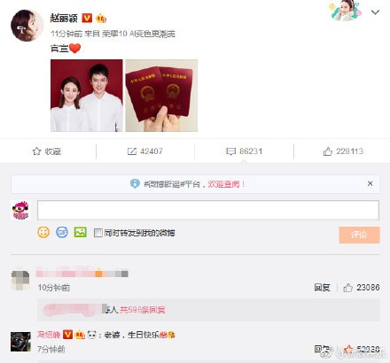 中國女星趙麗穎16日過31歲生日,和「蘭陵王」馮紹峰同時宣布領證結婚,時間點特別選在象徵馮紹峰生日數字的10點07分,兩人同步曬出合照和紅皮書,甜蜜寫下:「官宣」,馮紹峰隨後即刻到趙麗穎發文底下留言放閃,回應「老婆,生日快樂」。