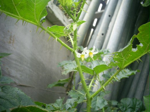 卵形或卵狀心形,5-7淺裂,長7-16公分。刺茄花朵腋生,聚繖花序,