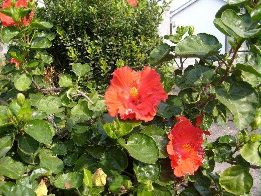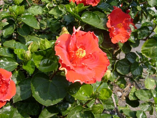 外觀特徵:朱槿(扶桑)品種很多,葉為單葉互生,有鋸齒緣, 全年均
