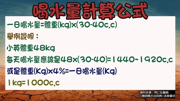 舉例說明:小英體重48kg,每天喝水量應該是48x(30-40)=1440~1920c.c