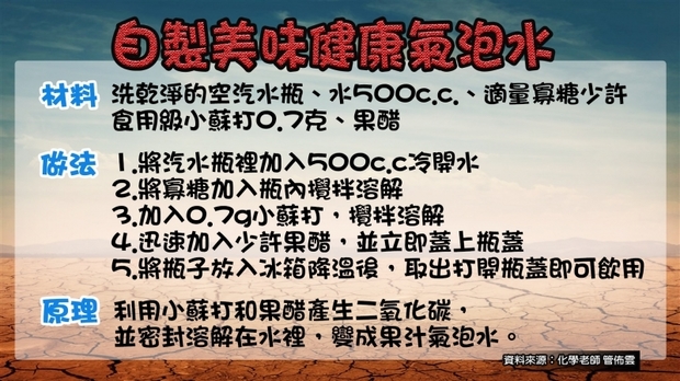 材料:空汽水瓶、水500c.c、適量寡糖、食用級小蘇打0.7克、果醋少許