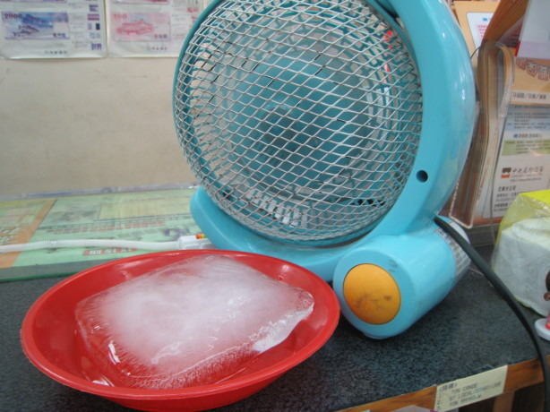 林沛賢表示,冰塊從固體變液態水,或水從液態變成水蒸氣,都需要「吸熱」,就像很多商家會在門口灑細細的水柱,或直接在地上灑水,當水蒸氣把熱帶走,就有降溫作用。所以,把冰塊擺在電扇前用電扇吹,會有涼涼的感受,但無法像吹冷氣一樣涼。