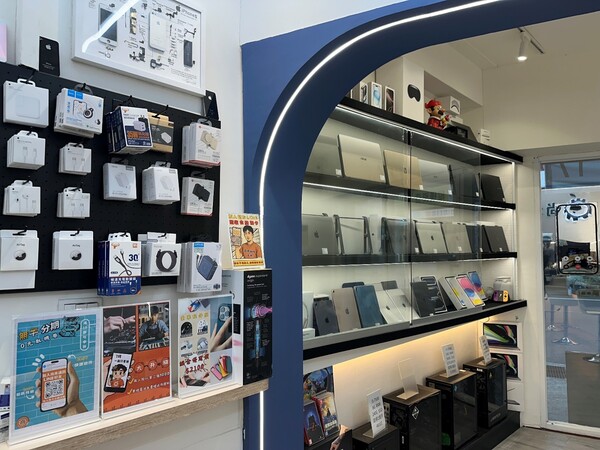 櫃台乾淨、展示櫃裡的手機和配件都擺得很整齊