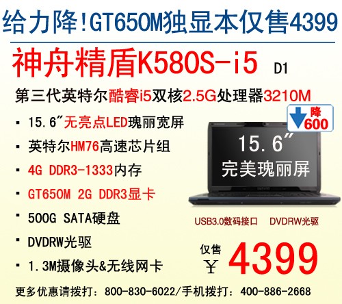 泡泡网笔记本频道11月8日 提到性价比,想必大家最快想到的就是神舟电脑的精盾系列笔记本,今天小编将为大家奉上神舟电脑一款具有超高性价比的游戏利器——精盾K580S-i5 D1,在不到4K5价位上给广大游戏发烧友们提供了一个不错的选择。下面就为大家简单介绍一下精盾K580S-I5 D1的强劲之处:它采用了最新的IVB架构酷睿i5双核2.5G处理器3210M,在性能和功耗上面将会有更出色的表现。配合全新顶级GT650M 2G DDR3独立显卡,与高速芯片组HM76,出色的4G DDR3-1333内存等,强强联手,打造终极战斗武器精盾K580S-i5 D1,使其各项综合性能得到出色发挥,同时精盾K580S-i5 D1采用500G SATA硬盘,足以应对日常存储需要,现双十一大狂欢狠降600元官方售价仅为4399元!