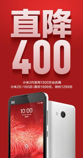 2月27日,小米公司宣布从今日上午10点起,原价1699元的16G版小米手机2S调价至1299元,在此前48小时内购买16G版小米手机2S的消费者将获返还400元代金券。小米公司同时透露,小米手机2系列出货量已突破1500万台,是销售量最大的单款国产智能手机。