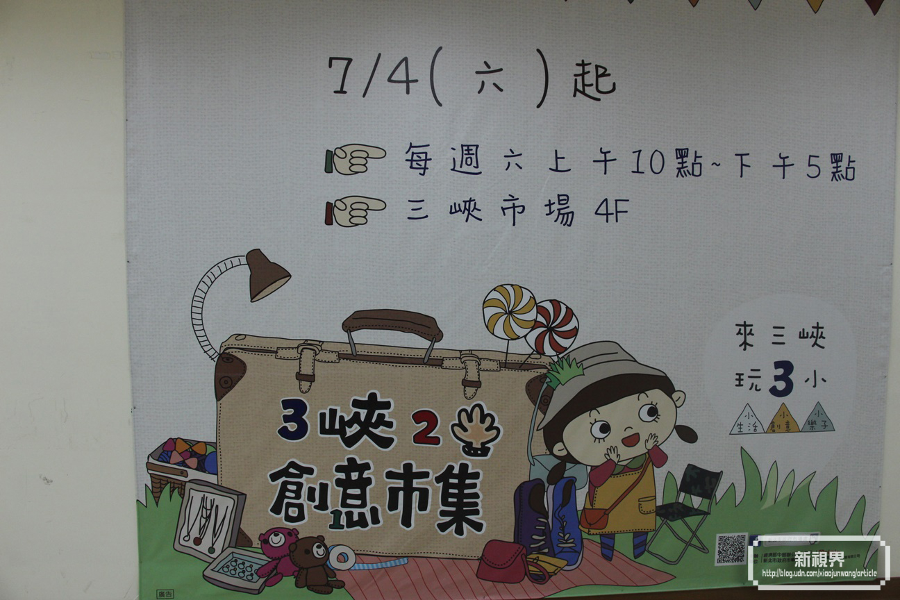 吃飽喝足之後呢,就可以走到4樓逛逛「三峽二手創意市集」,每週六上午九點到下午四點,在三峽市場四樓舉辦,目前到年底報名擺攤都是免費的,限額40攤。為了讓更多人新北市民體驗二手市集的樂趣,推廣愛物惜物的環保概念,新北市政府市場處表示,販賣商品不僅限於二手物,凡是有原創性、手工製的物品皆可展售。希望藉此建立一個分享創意及點子的平台,打造具有三峽文化特色的二手創意市集,成為三峽地區觀光的新景點