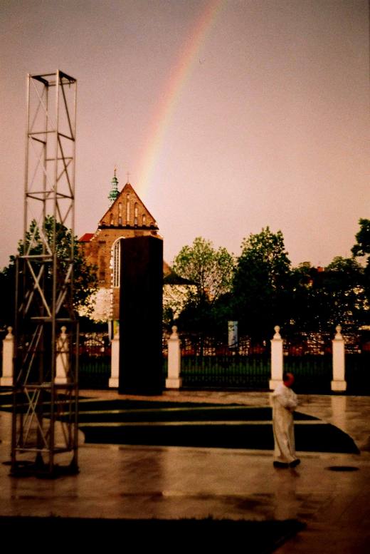 剛進教堂圍牆,就聽友後方的腳步聲,一回頭,也是個拎著相機的人,是個金髮女孩,咯咯的笑了聲。就匆忙的照了幾張像,也忘了那張是用 Helios 那張用 Pancolar 拍的。彩虹越來越淡。