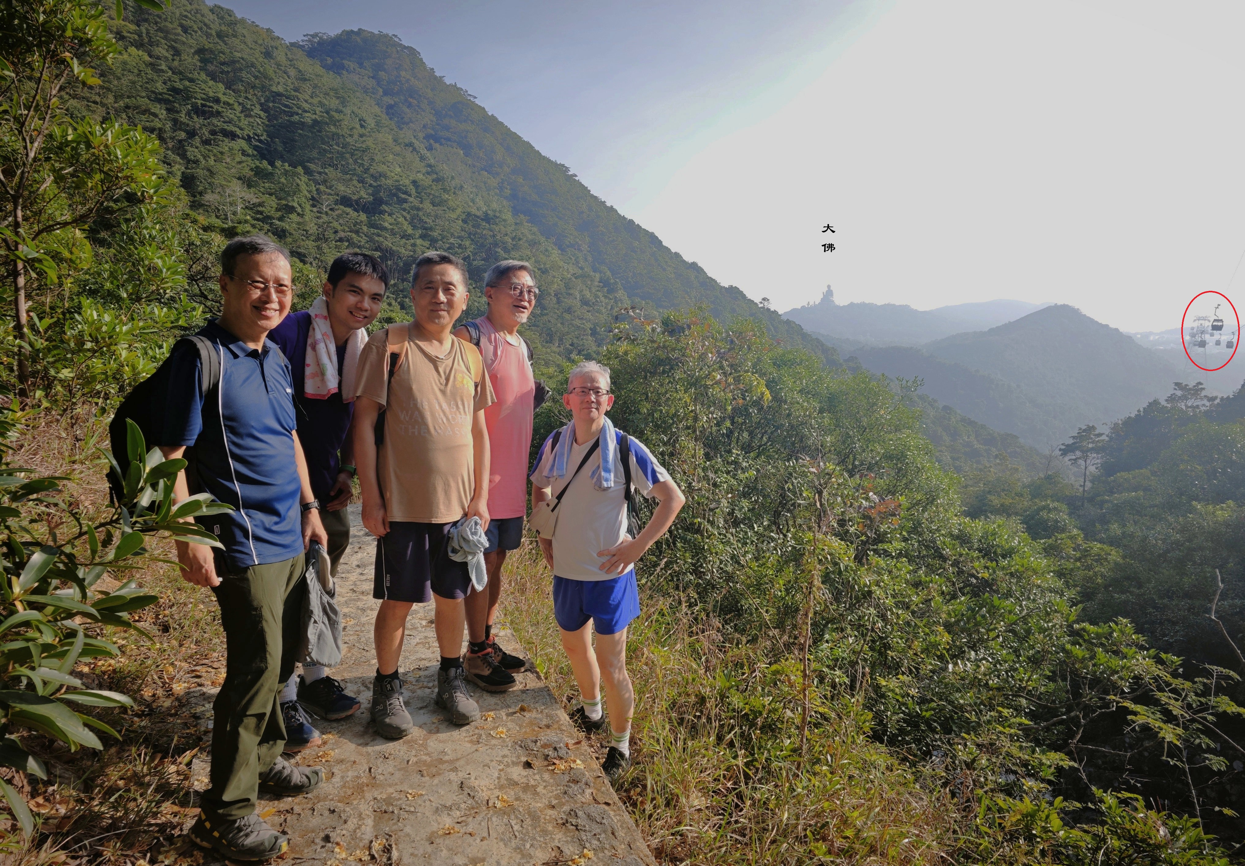 謝紹光醫生,魄力驚人,仍然執業,更在港大牙科兼職任教。陳君漢醫生,曾任教港大腦外科,後來成為月球人。黎啟生律師,前副律政專員,退休獲頒俗稱荷蘭水蓋BBS,了不起。我們75屆,也是人才濟濟。昂坪巴士站→食水配水庫→食水缸→了见墓+藏经舍利塔→彌勒诸天寳塔→般若殿(大屿山海拔最高的佛教处所)→彌勒金腰带→360轉向站→360桟道→昂坪巴士站。7公里,總爬升230m,2.9小時。