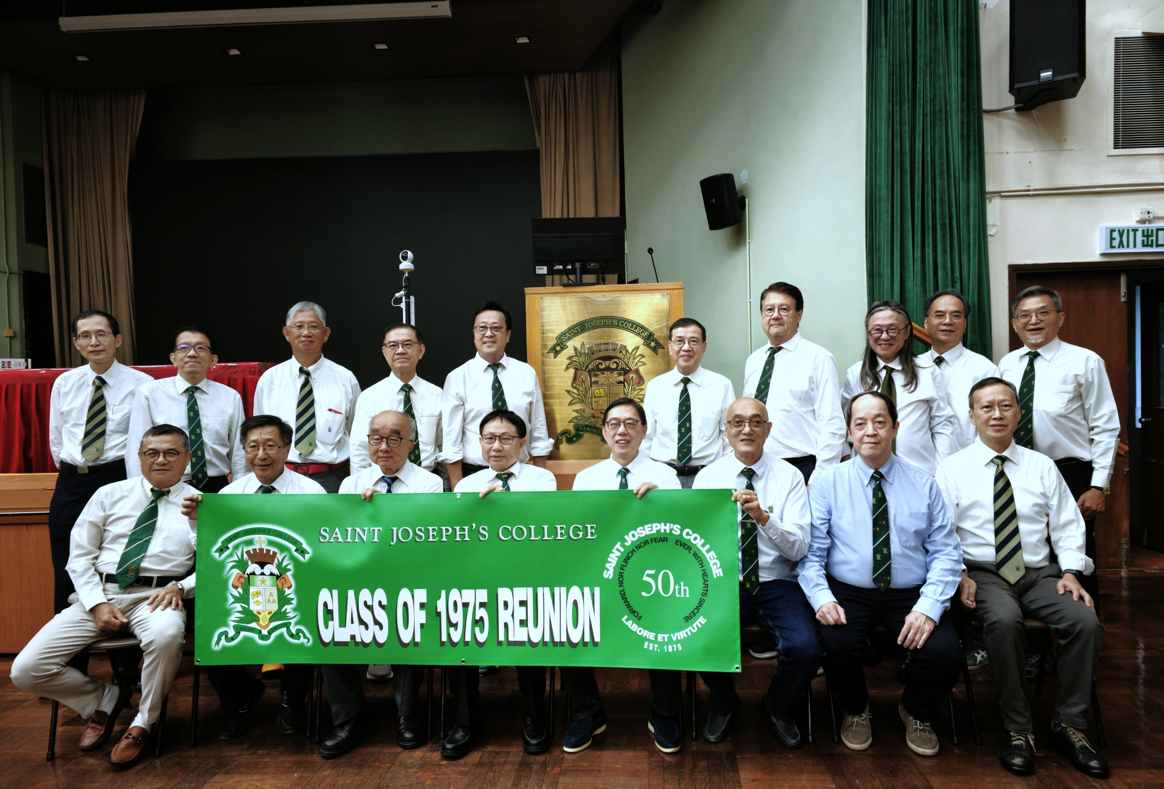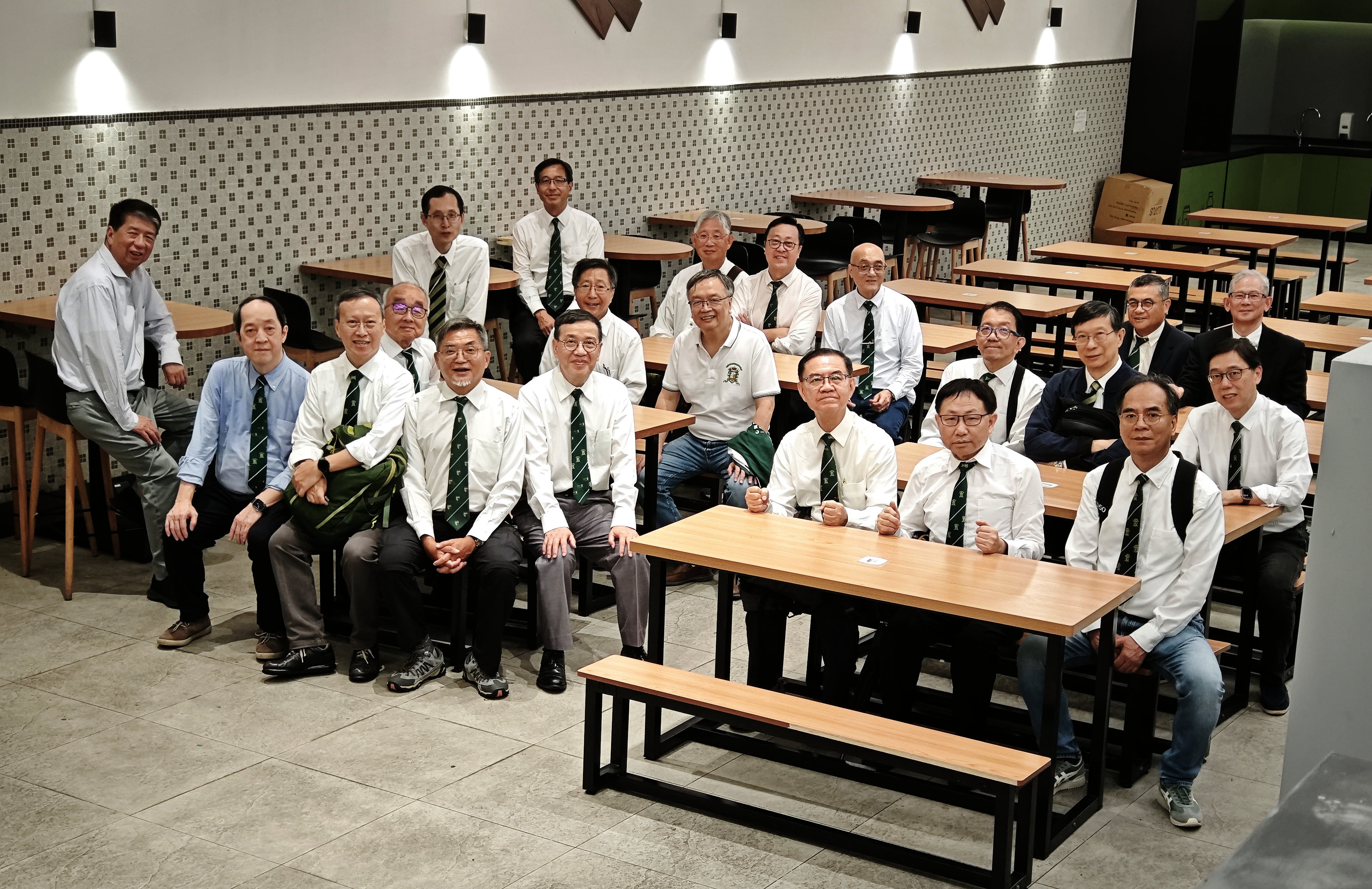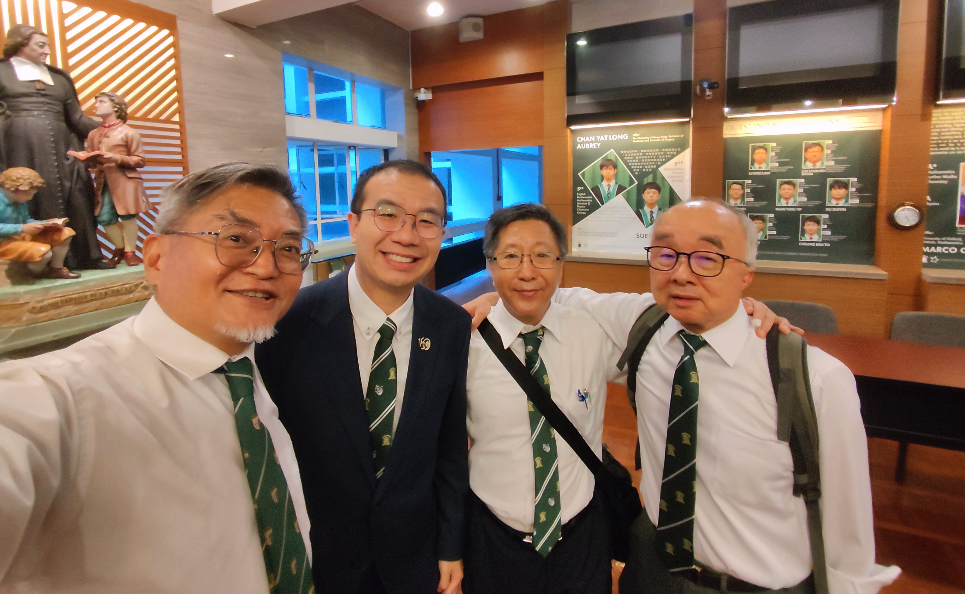我們是學校一百週年屆的會考畢業生,當年學校出品了一條繡有中文字“百年”的領帶。今年只有6個同學結上這條50年前的校服(Francis有事早退,沒拍這合照)。