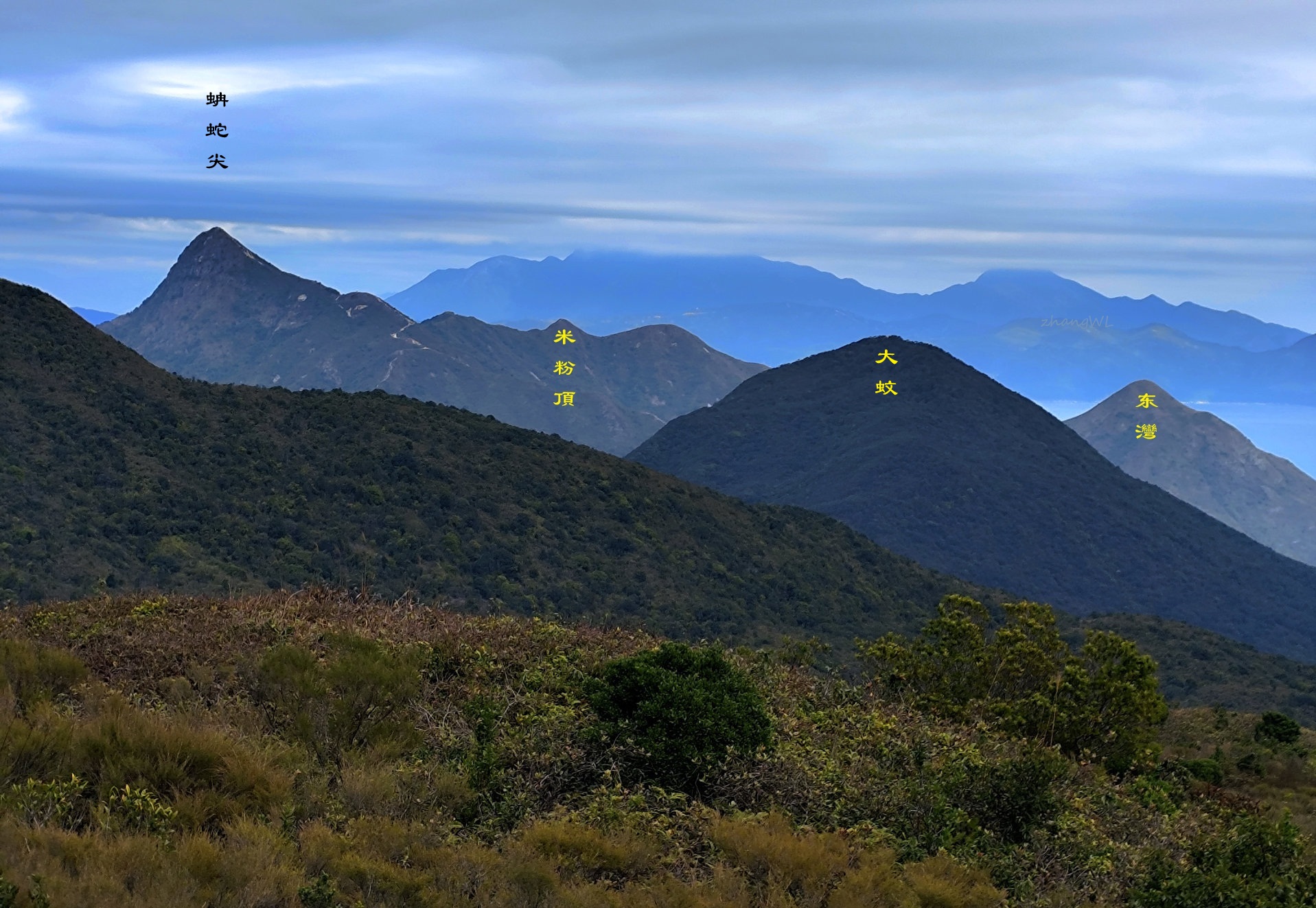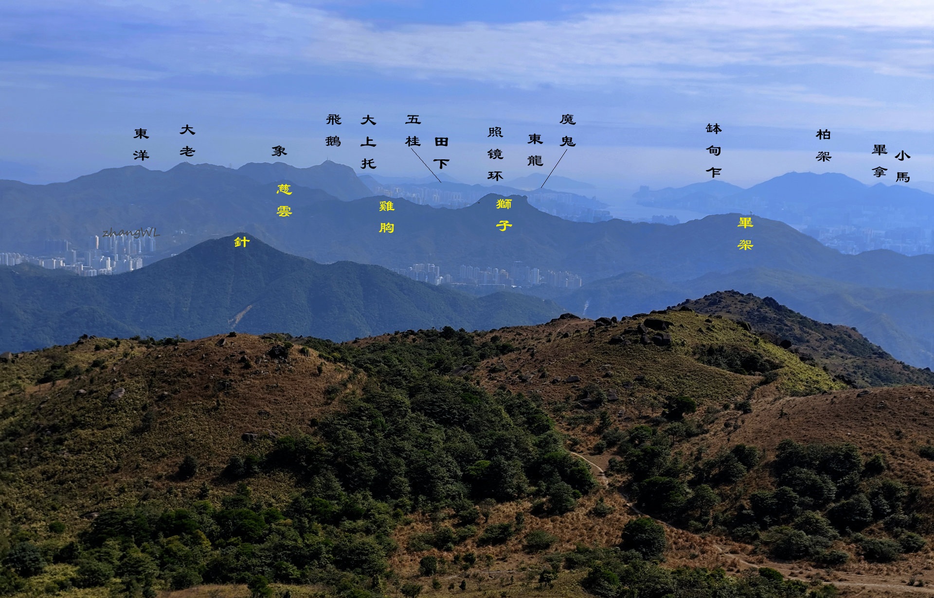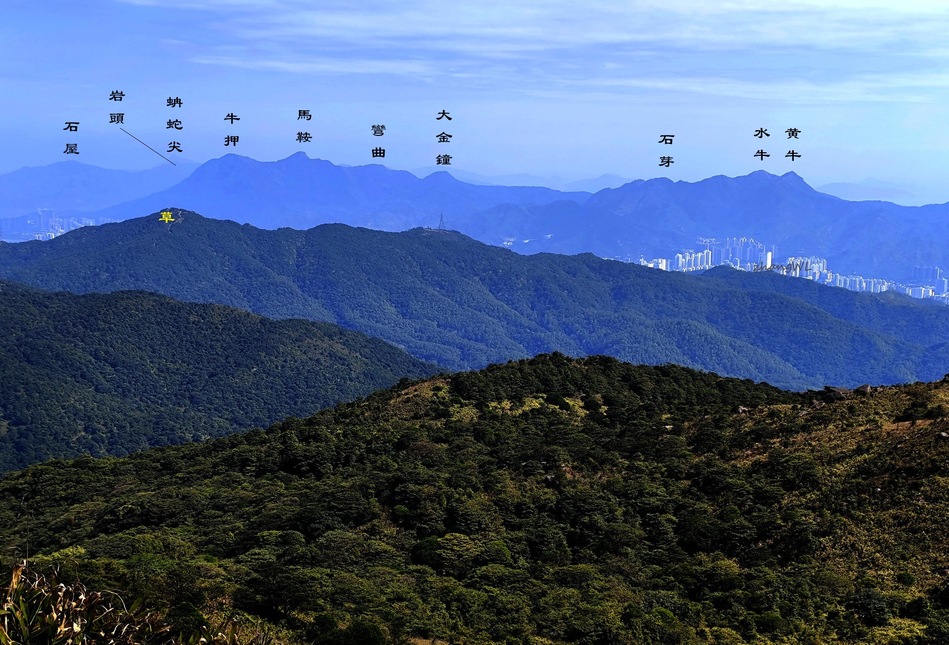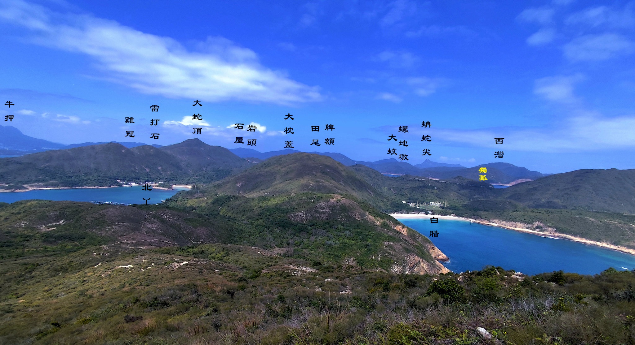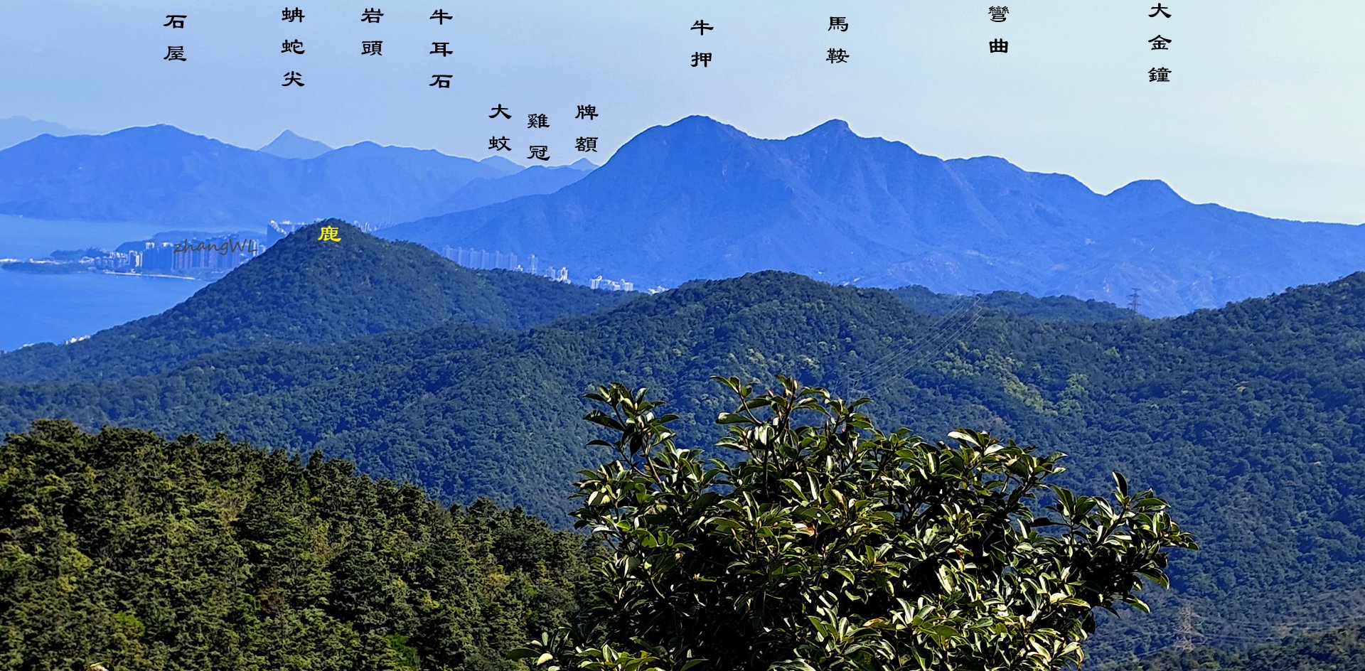 在大枕盖眺望北方,蚺蛇尖或擔柴山以北就是剛剛入選中國最漂亮海灣之大鵬灣,其後面就是大鵬半島。余只登上過大鵬灣西端的兩個高山:四次登大梧桐,一次登梅沙尖。下圖12點位置,在火石洲之前,剛好冒出一丁點山頂的是下一個介紹行程的白虎山。