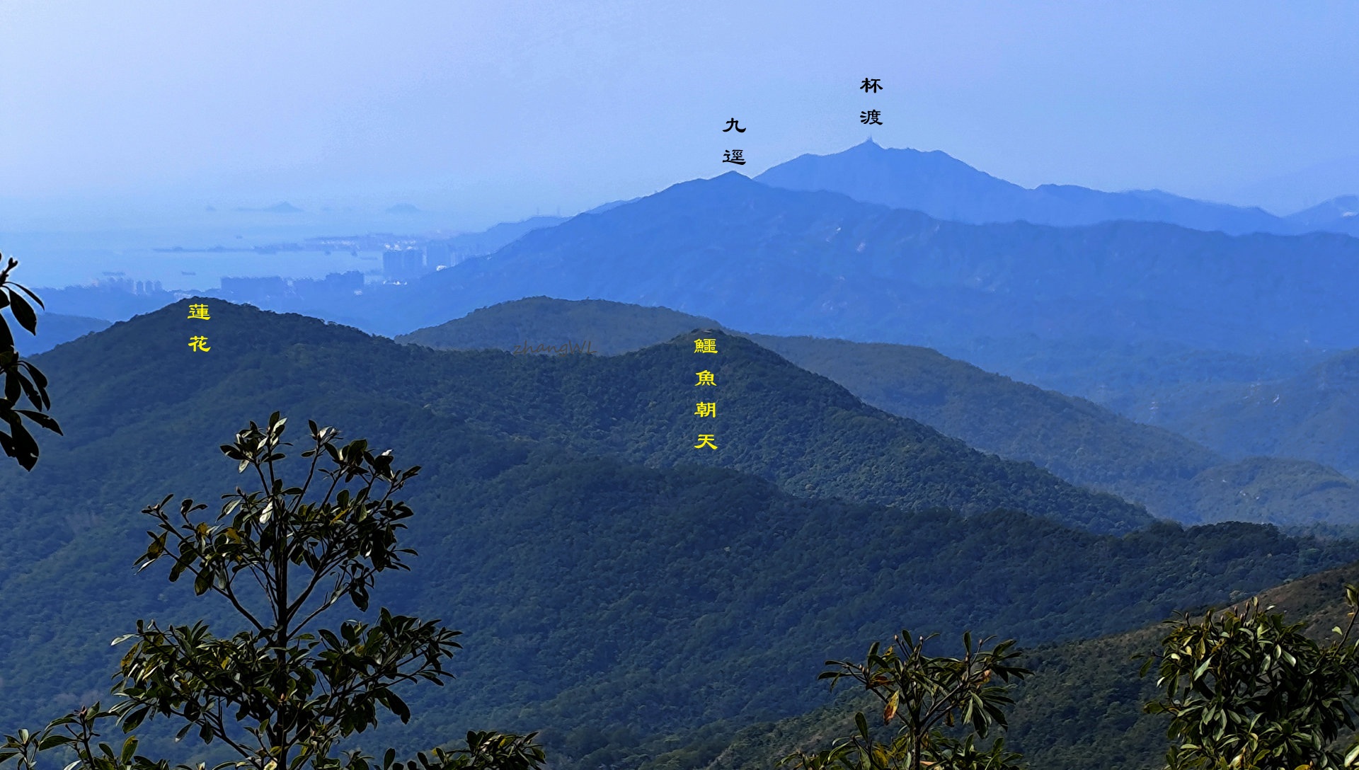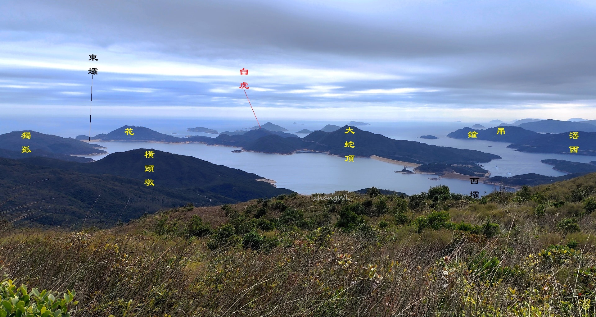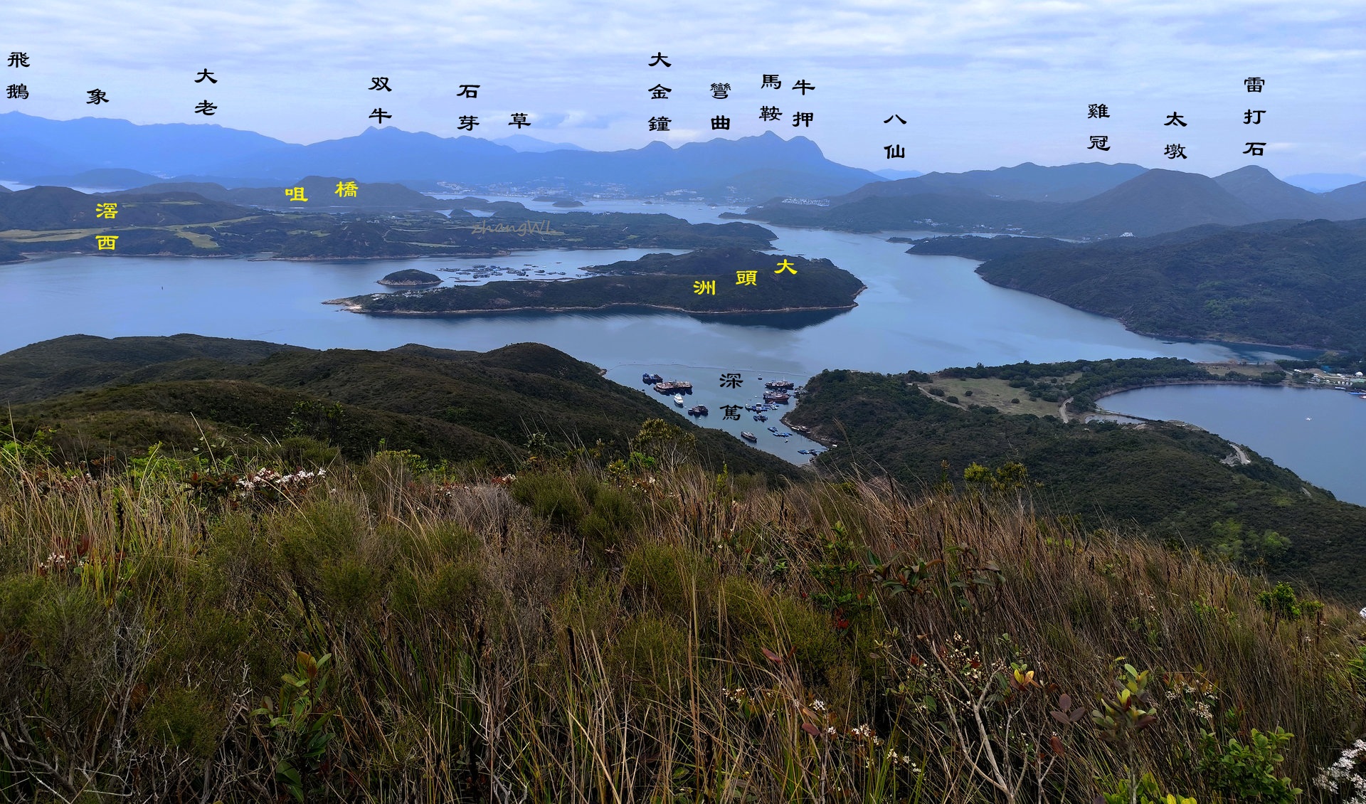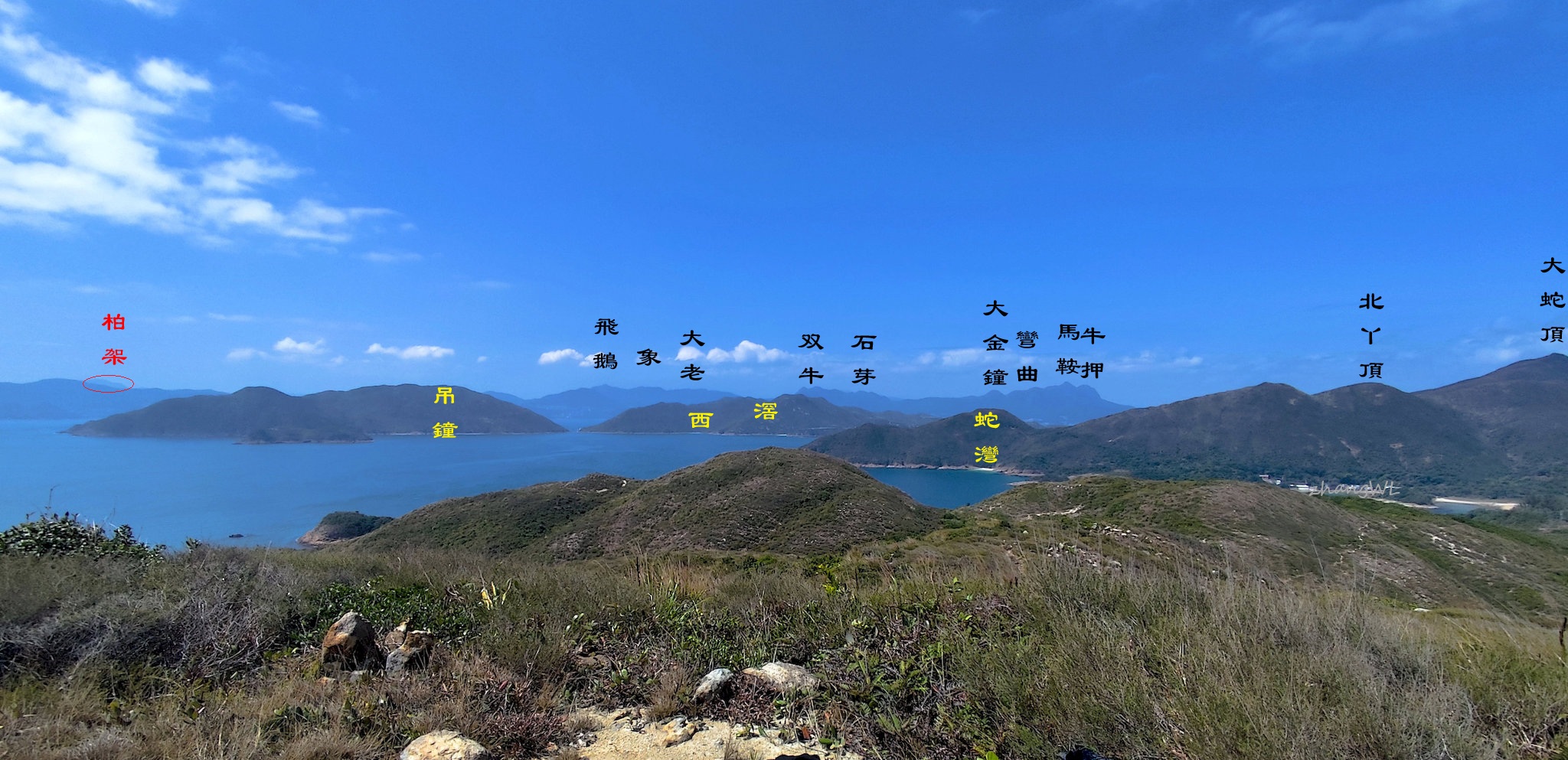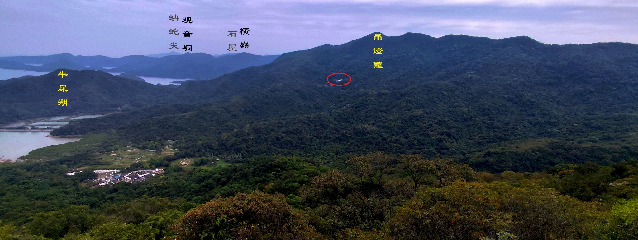 在大枕盖眺望北方,蚺蛇尖或擔柴山以北就是剛剛入選中國最漂亮海灣之大鵬灣,其後面就是大鵬半島。余只登上過大鵬灣西端的兩個高山:四次登大梧桐,一次登梅沙尖。下圖12點位置,在火石洲之前,剛好冒出一丁點山頂的是下一個介紹行程的白虎山。