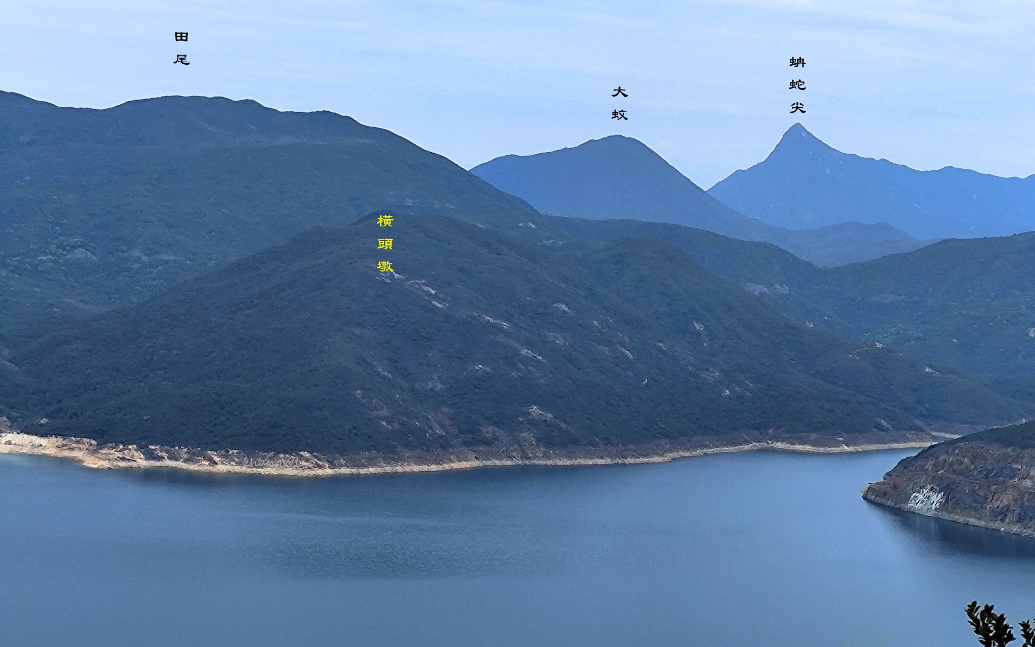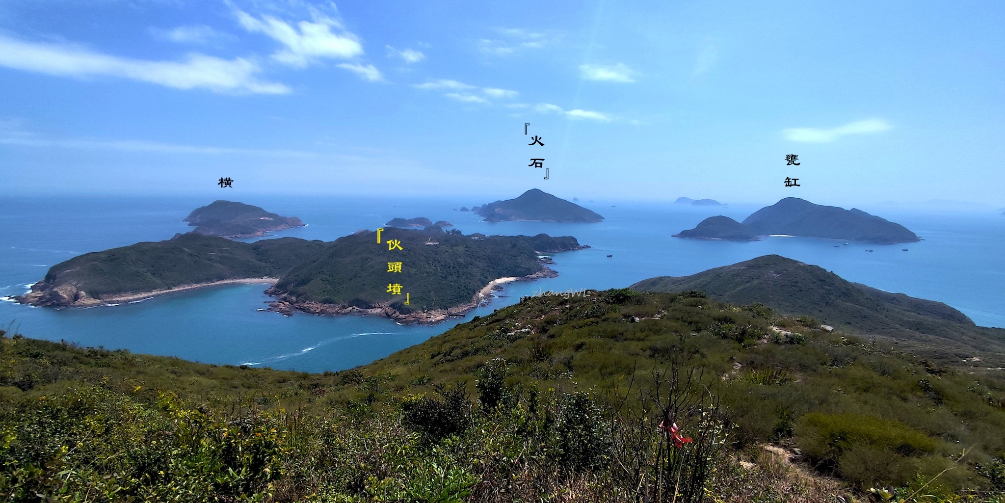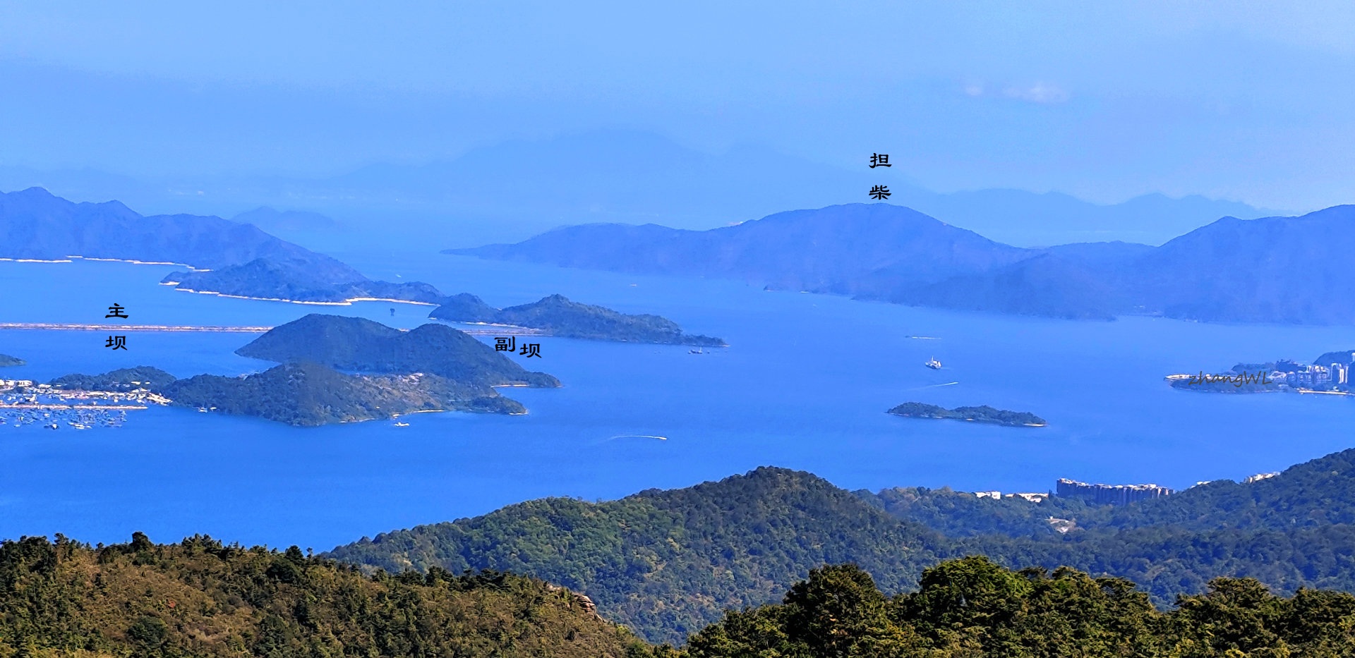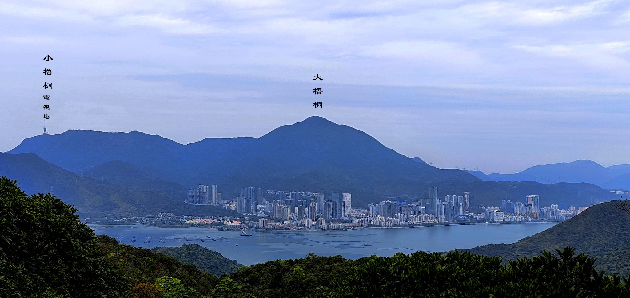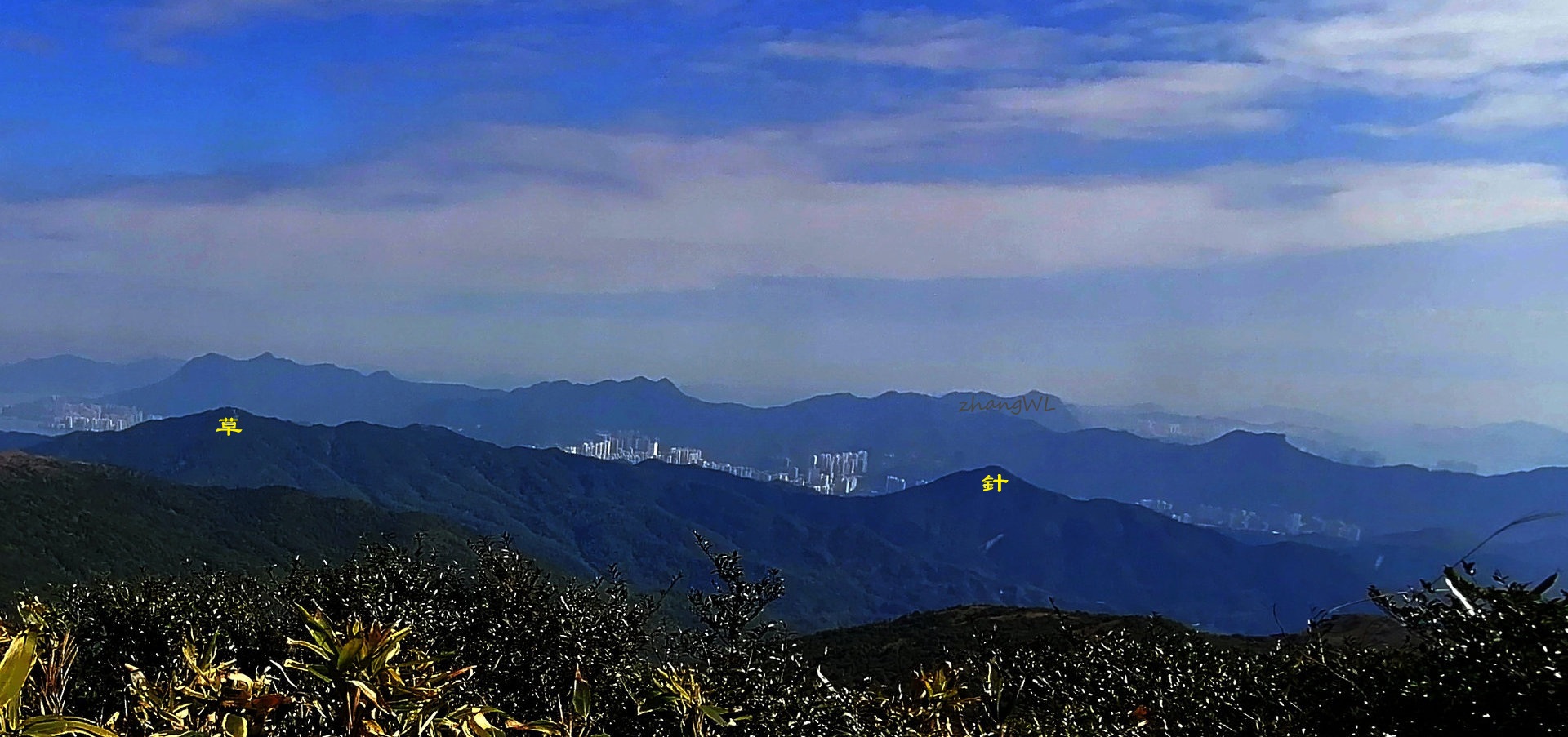 在大枕盖眺望北方,蚺蛇尖或擔柴山以北就是剛剛入選中國最漂亮海灣之大鵬灣,其後面就是大鵬半島。余只登上過大鵬灣西端的兩個高山:四次登大梧桐,一次登梅沙尖。下圖12點位置,在火石洲之前,剛好冒出一丁點山頂的是下一個介紹行程的白虎山。