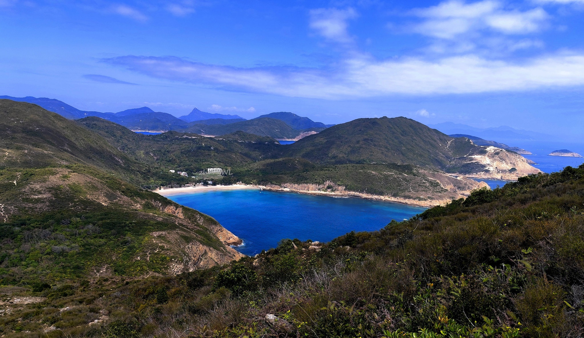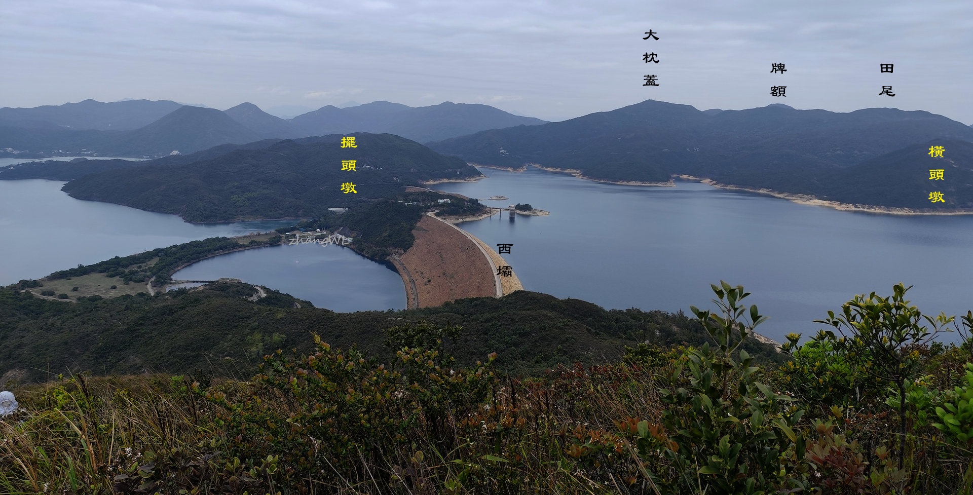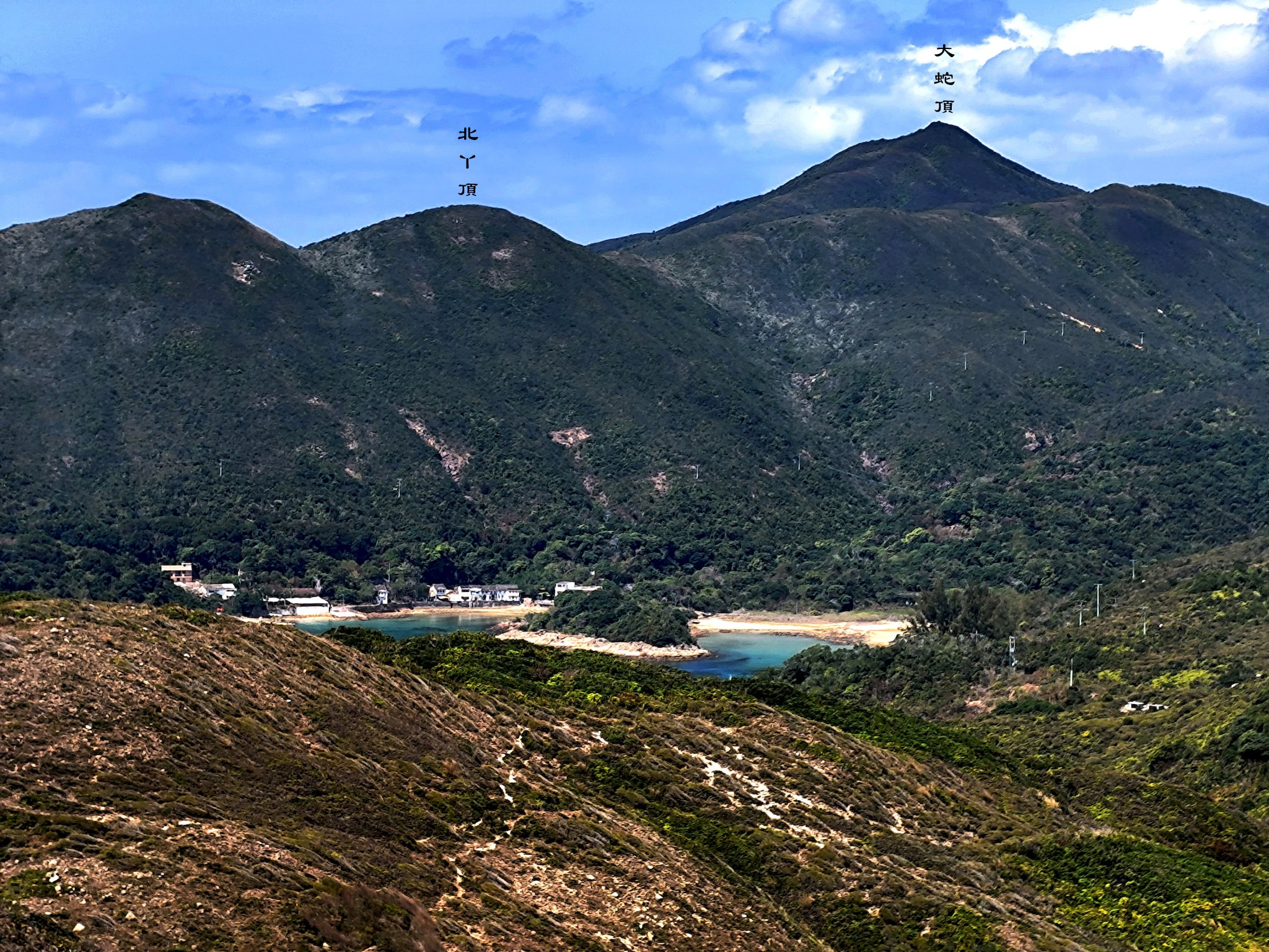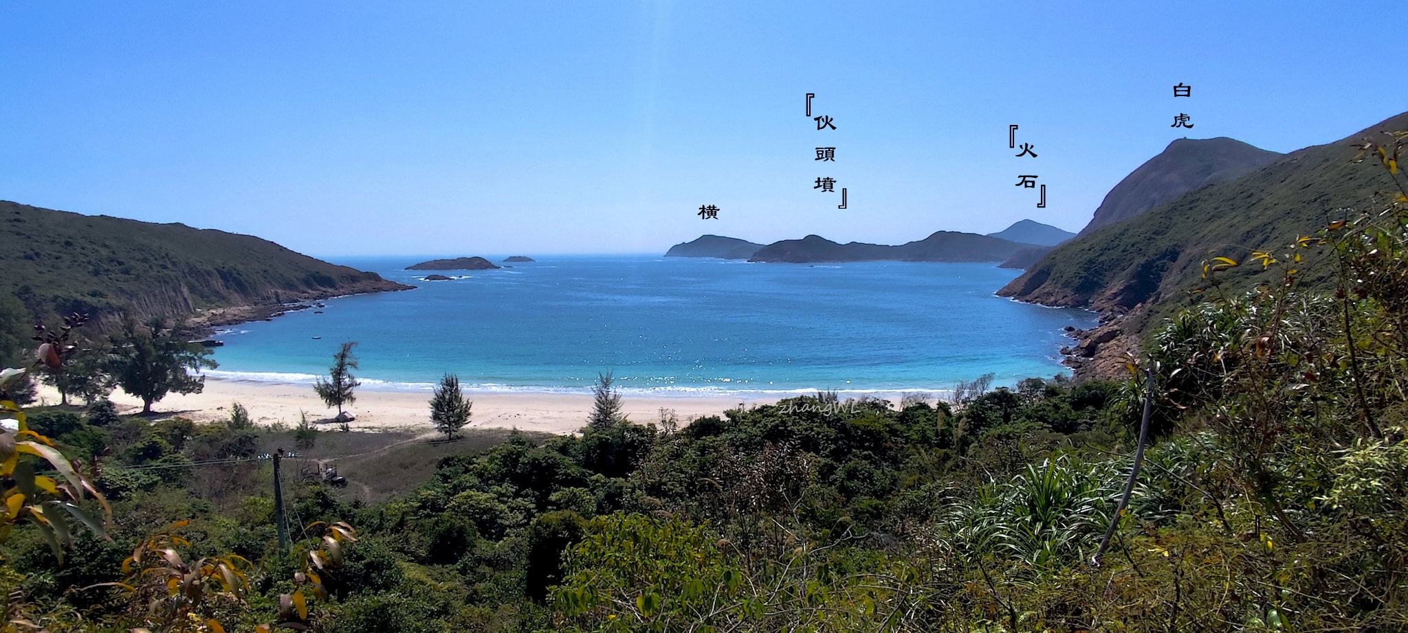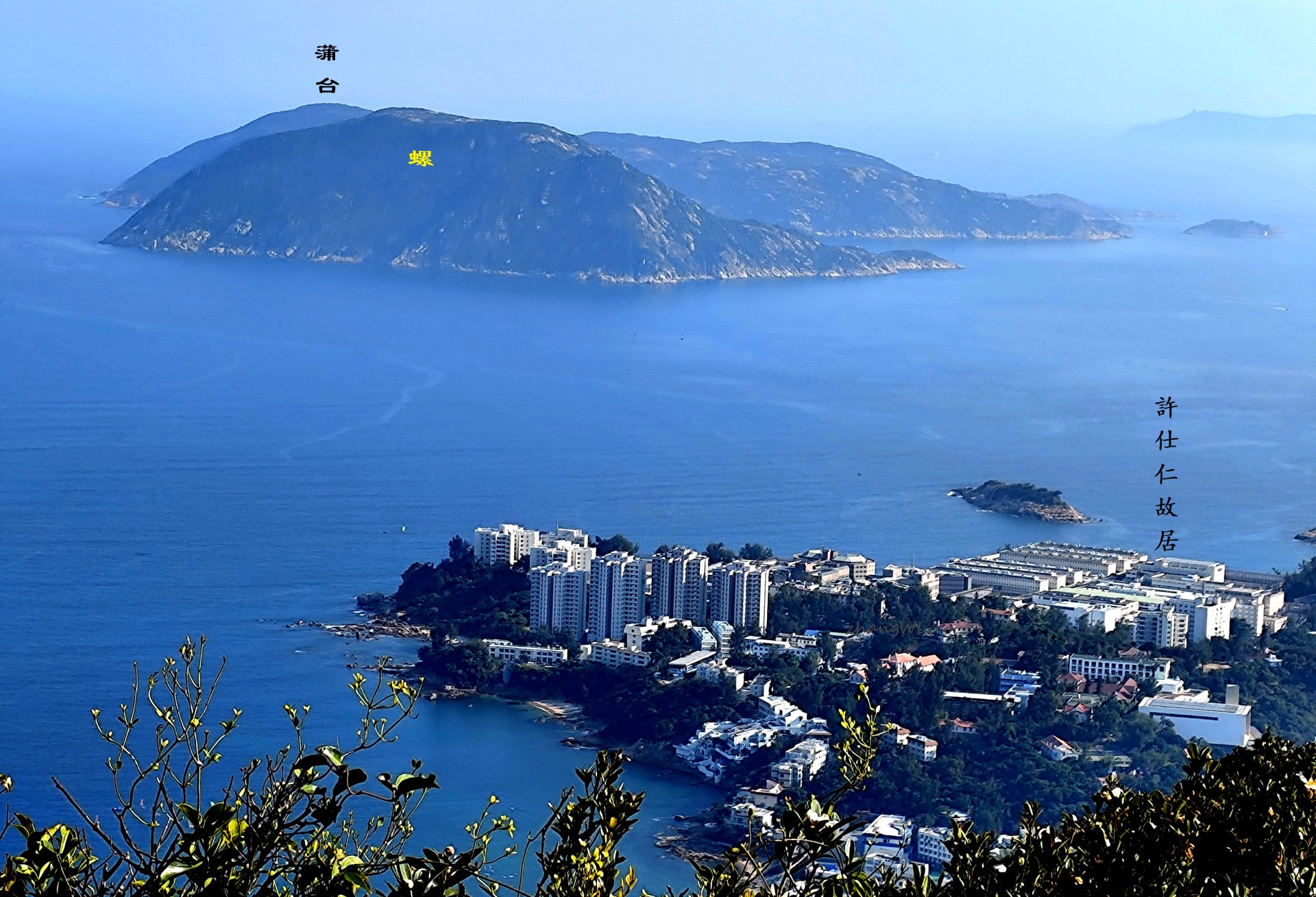 在大枕盖眺望北方,蚺蛇尖或擔柴山以北就是剛剛入選中國最漂亮海灣之大鵬灣,其後面就是大鵬半島。余只登上過大鵬灣西端的兩個高山:四次登大梧桐,一次登梅沙尖。下圖12點位置,在火石洲之前,剛好冒出一丁點山頂的是下一個介紹行程的白虎山。