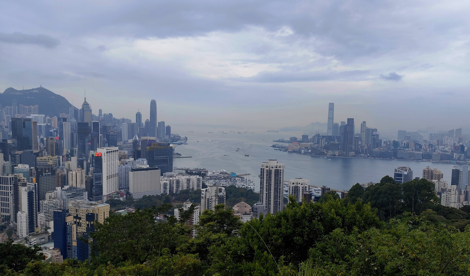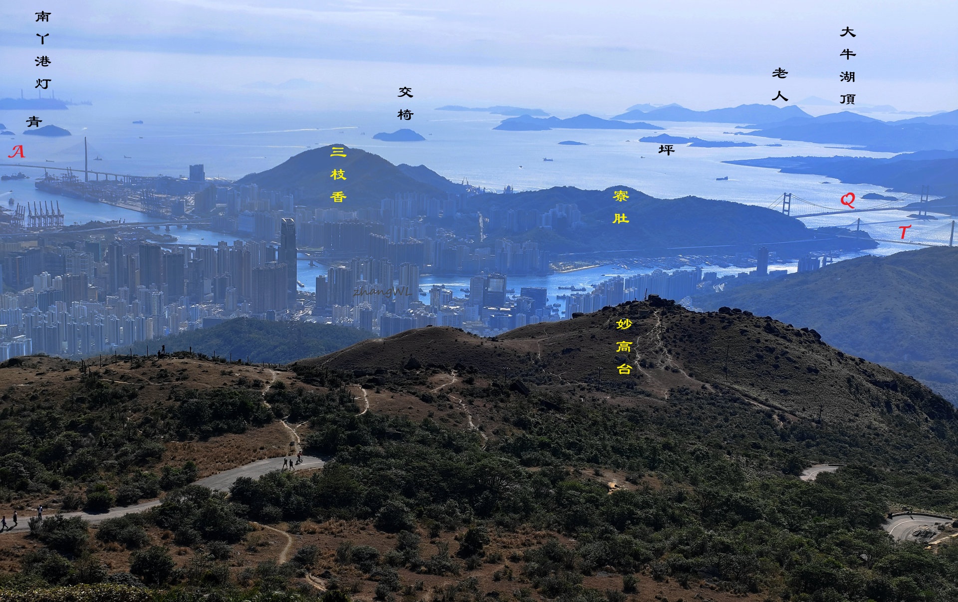 香港第一峰,可惜有點霧霾。仍然看到境內大半地方,但看不到澳門、珠海。酷暑時吹南風,港珠澳大橋、澳門塔、澳門中銀都清楚辨認。是日拍到3橋:A昂船洲、Q青馬、T汀九。