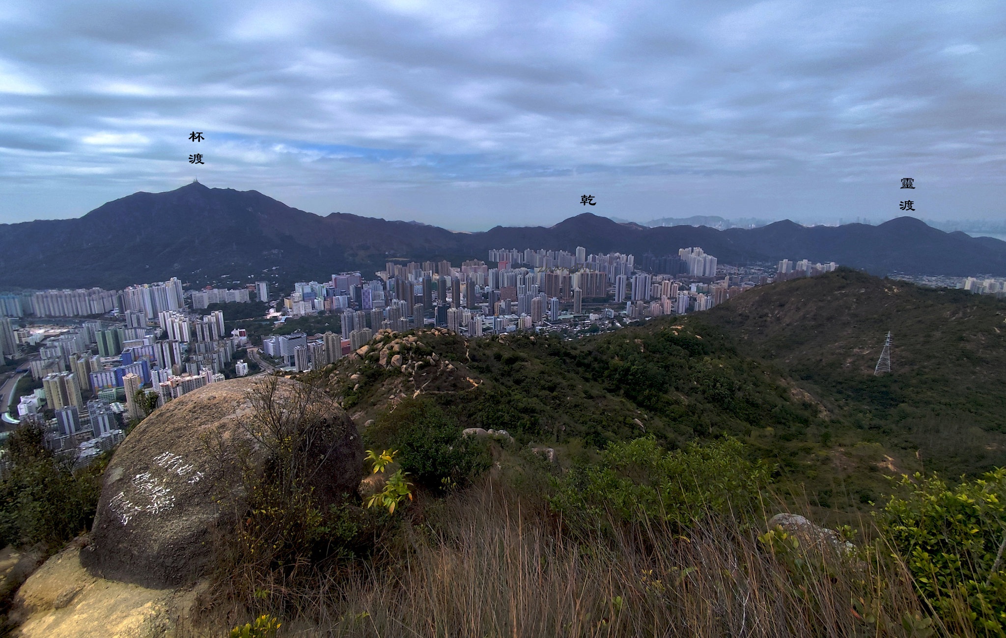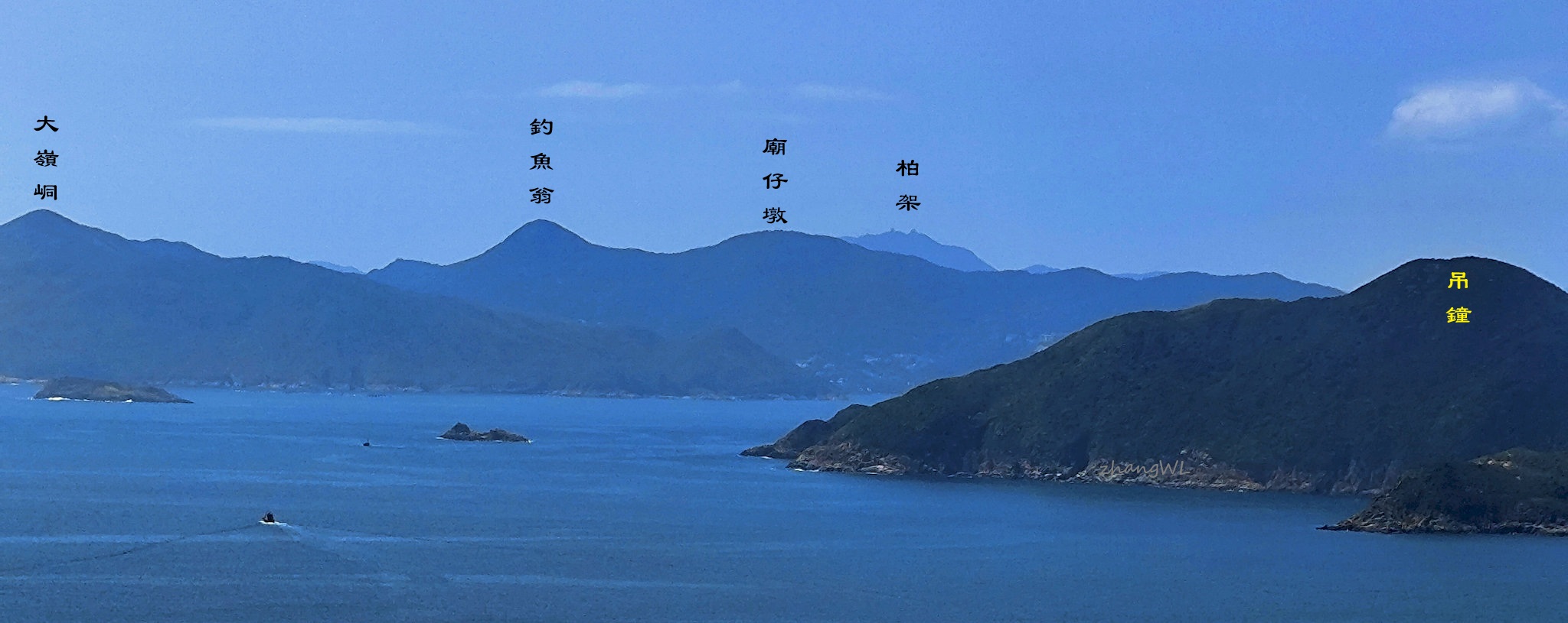 吊鐘花之前介紹過不只一次,這次主要拍山水。是日起步時藍天白雲、天朗氣清,空氣素質之佳是香港酷暑以外所罕見。惟走了個多鐘,差不多過了花叢,天上飄來越來越多黑雲。幸好沒下雨,霧霾也沒有隨來,視野仍然清澈,相片中顯示的太平山、梅沙尖、浦台島都大概距離25公里。但光線偏暗,美中不足。