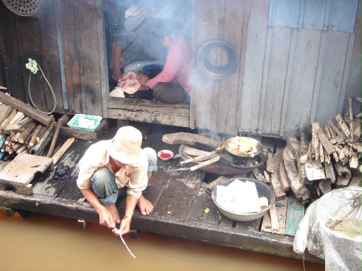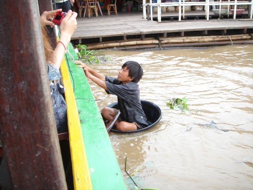 第三天,到了洞里薩湖,這位團員開始發麵包給小朋友,但這麵包好像似曾相識,仔細一想,原來是飯店自助式早餐的麵包。在岸邊發麵包,船旁圍了一群孩子,孩子有些沒有拿到不肯離去,船家也將船慢慢駛離岸邊,沒想到她手裡還有沒發完的麵包,竟然用力往岸邊扔,扔上岸的孩子撿走,扔到湖裡的孩子反射性的去撿,但撿起來後,竟生氣地用力往湖裡扔。我想當地的孩子也不是不挑的。