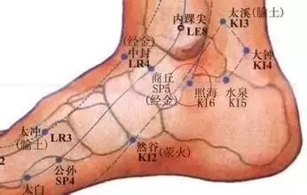 照海穴位於足內側,內踝尖下方凹陷地方,“照海”顧名思義,指腎經的經水在此大量蒸發,具有吸熱的作用。按摩此穴位能緩解咽喉乾燥、目赤、失眠等症狀。