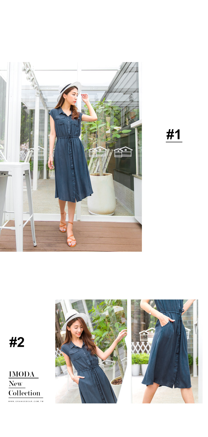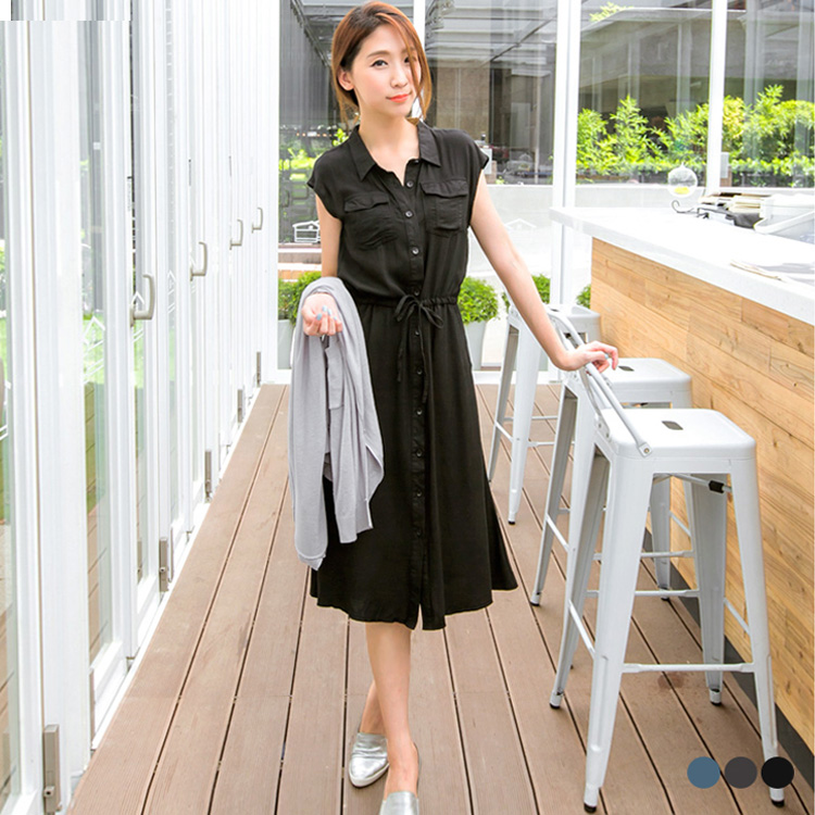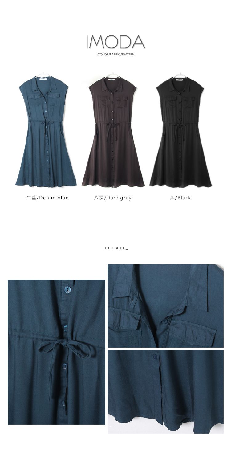 0620新品 知性悠閒~純色排釦造型抽繩連身洋裝.2色