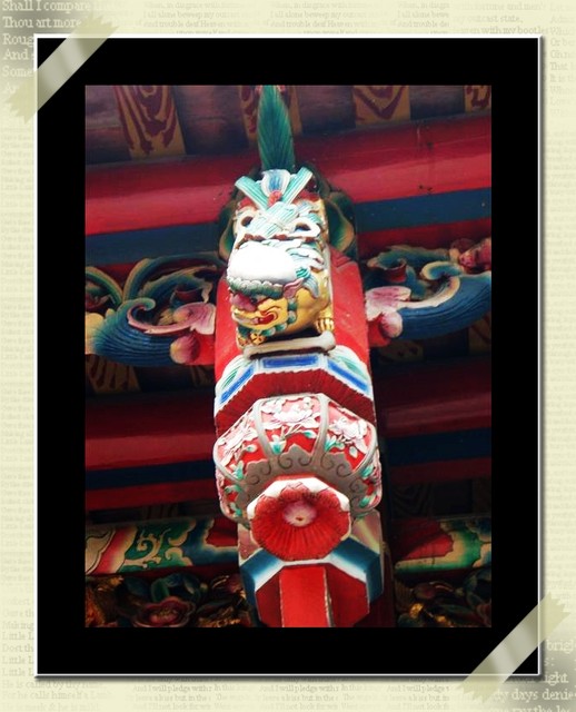 不過倒吊獅真的很可愛啊>///<!通常垂花上面是不會有其他雕飾的,文昌廟才會有書卷獅~有些廟還看的到阿逗仔(呃…紅毛人…呃…呃…外國人…)在抬著橫摃…