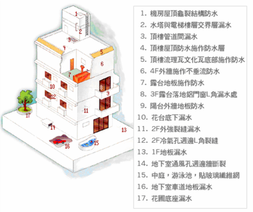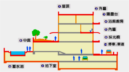建築物之漏水問題雖與其構造型式(木造、磚造、RC、SRC、SC)有關,然若防水設計與施工品質不良,則從上到下、由外而內可能產生裂縫與開口之處,均是水分的滲漏路徑,如圖1及圖2所示。
