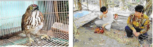 (1)鳳頭蒼鷹「逞凶」啄死公雞母雞,案發後被農場主人「逮捕」,蒼鷹額頭也受傷。(記者蔡淑媛攝)圖1左