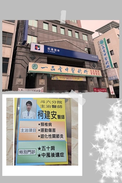 其中我看的傷科醫生就很年輕,跟我兒子Jimmy是一樣的年紀,長的溫文儒雅又很帥,在我眼裡是個好孩子,對於病患很有耐心,傾聽並細心診療令人很有安全感有安定的力量,最重要的是...年紀輕輕,在我看來就是醫術精湛不馬虎,這一個月來,我病情獲得不少的改善也減輕疼痛...雖然還在持續的治療與復健中,但溫和熱切的氛圍中是醫護人員所帶來的安全感令人有信心地接受治療與復健,這是最重要的肯定。我要大大讚揚這「一品堂中醫診所」的「斗六分院」,更大力推薦年輕有為的傷科「柯建安」醫師,若不是他,以我這個沒耐性的病人來說,我可能就〝半途而廢〞是因為他的耐心、耐性、耐磨、傾聽、細心,還有針灸的針法功力,否則早就逃之夭夭對中醫傷科沒信心呢!希望在他的診治下,我可以早日康復!平安最好!