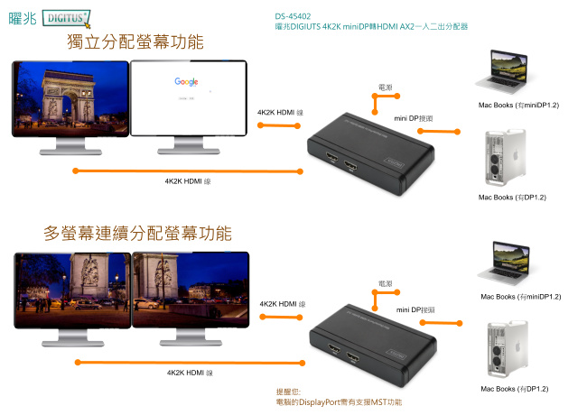 商品訊息描述: 曜兆DIGIUTS 4K2K miniDP轉HDMI AX2一入二出獨顯分配器
