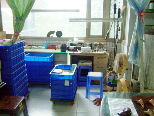拜訪張師傅對我來說是非常有收穫的學習旅程,一到張師傅位於半山腰的工作室,四周環境清幽,遠離都市的塵囂吵雜,一到門口一棵掛滿陶笛的陶笛樹非常特別,進到工作室,左邊窗前是張師傅製作陶笛的工作臺,上下左右擺滿了各種工具,右邊大的會議桌上則擺滿了各式各樣大大小小、琳琅滿目的陶笛,再往後走則是燒製陶笛的電窯室與儲藏間。