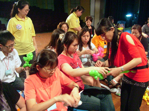 下午的造型氣球,藉著分解動作的教學,一動一動地做出臘腸狗、貴賓狗、寶劍、機關槍、花......等,許多人應該也都是生平第一次折氣球,所以更是顯得新鮮好玩......