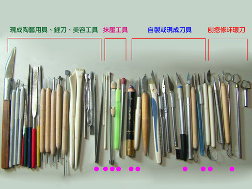 做陶笛真正常用到的,其實是用不了這麼多工具,一些重複的工具只是大小、口徑的差異,有利於製作大小不同的陶笛時比較順手好用、或這支比較鋒利......,或怕遺失、備用。