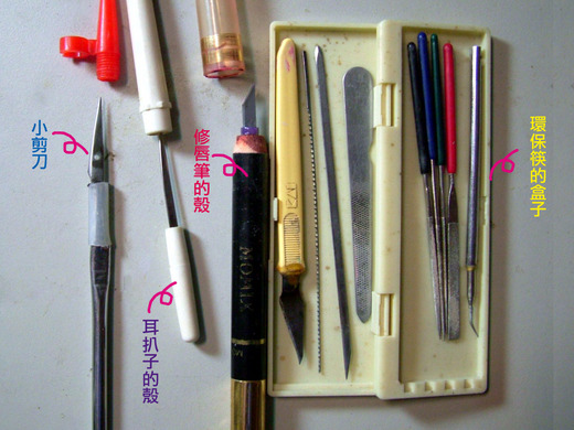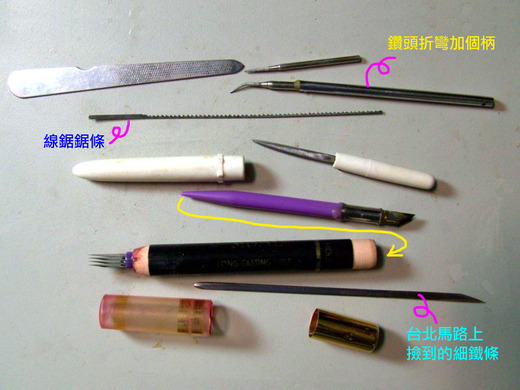 現成的筆刀要挑鋁製或筆桿輕的,或者自己用修眉刀桿做成,用起來比較順手,實心筆桿太重、太長不太好用。