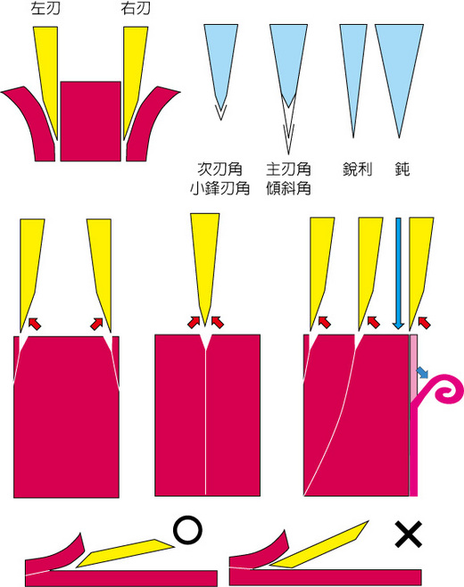 古代有庖丁解牛,講的是以高超的技巧,在牛的筋理之間,游刃有餘地將整頭牛分解的故事,形容廚師刀法高超--用割比用砍劈的方式更使刀發揮得淋漓盡致,而不損傷刀刃。大致上砍劈用的刀劍傾向V形開刃,才不會滑刃切歪。切割用的刀刃則以「半V」開刃,並分為左刃(左撇子用刀,會特別注明)、右刃,刀身愈薄相對開刃角度就愈小,左刃右刃差別也愈不明顯,相對也愈鋒利,但卻容易扭曲缺角;太厚,則重量加重,開鋒較鈍,像裁紙用的裁刀幾乎呈90度角,剪刀開刃角度也頗大,但刀身厚的好處是較不會變形(剪刀上下都是右刃)。