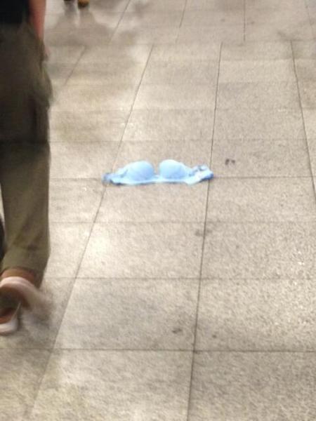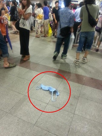 在東京立川車站的通道正中央竟然出現一個超不可思議的東西,一件藍色的「野生的胸罩」靜靜躺在地板上,彷彿呼喚行人把它撿回去。