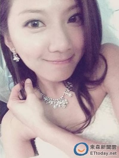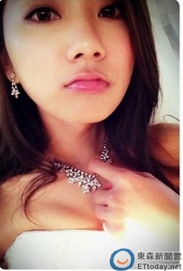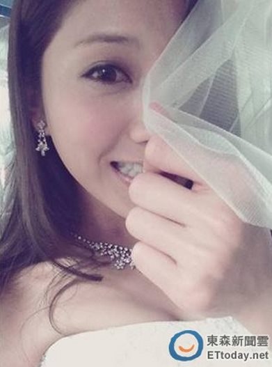 照片中的蔡黃汝穿著白色婚紗,露出甜美燦笑,胸前因衣服剪裁形成的「愛心奶」,在擺姿勢時擠出一條深深的事業線,極具立體視覺效果,性感滿點。