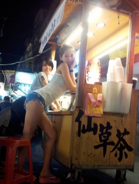 「饒河街賣仙草茶的美眉」,一名正妹穿著無袖上衣及迷你短褲,翹臀拍照,姿勢撩人,有網友讚「姿勢100」、「太sexy了」。