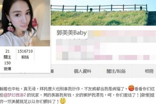 郭美美疑似不滿被批評在微博寫下:「躺著也中槍,真無語,拜託想紅也別拿我炒作,男的羨慕我有錢,女的嫉妒我漂亮,一雙美腿就足以讓你們顫抖了!」