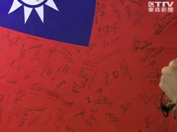 國旗上滿滿的簽名是中原大學企管系學生謝承容和藍曼云暑假在歐洲自助旅遊最有成就感的收穫,藍曼云指出,「像這個他是外國人,他就寫了中文。」