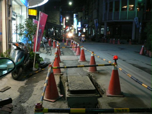 小鎮的夜晚一向是寧靜無聲,最近因為要電線地下化以及光纖網路化,整個小鎮幾乎要翻了一遍,有時出門手腳慢一點,回家都無路可歸,近在咫尺遙遙相望,不得其門而入。 工作人員非常賣力的趕工,我是第一次看到地是用切割器切開需要的寬度與長度,再用挖土機將地挖有約一個人高的深度,立即埋管線,馬上灌漿,上面加蓋一片大鐵片,預防人車跌倒。