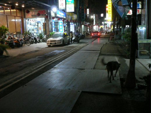 工人們一邊趕工,一邊在不平的路面上加上一片片厚實的鐵板 。白天還好,挖土機,水泥車轟轟作響,掩蓋了車子壓過鐵片與不平地面而產生的框啷之聲, 無啥感覺。