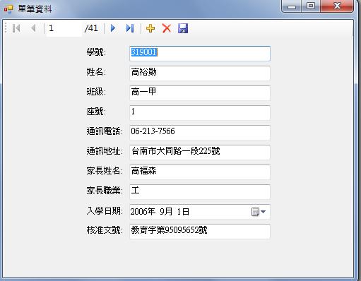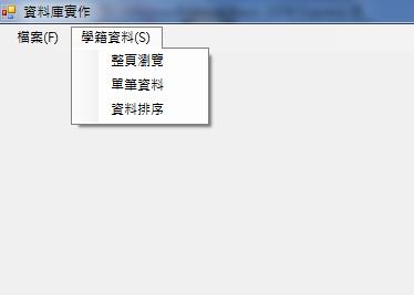 上次我們已經利用「資料連結精靈」完成了,DataGridView和詳細資料的部分。接下了!我們將要建立「主操作表單」。在表單上建立「MenuStrip」物件,然後依序建立了兩個主選項:檔案、學籍資料。在檔案的主選項底下再建立其次選項:結束!然後在「學籍資料」的主選項下載建立其次選項:整頁瀏覽、單筆資料、資料排序。