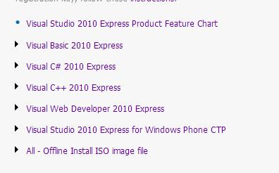 進入後,一樣的上方功能列可看到一個 “DownLoad”的功能選項, Click 進去吧 然後你就可看到 Visual Studio 2010 Express 的下載選項,你可下載 .iso 檔再燒成光碟來安裝,比較方便! 相信你知道是那一個下載連結吧!