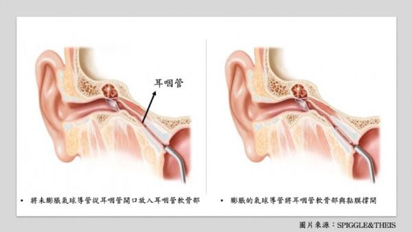 丁冠中醫師進一步說明,耳咽管氣球擴張手術是一項微創且安全的手術,在全身麻醉與內視鏡系統輔助下,經鼻腔將氣球導管從鼻咽部旁的耳咽管開口放入軟骨部,膨脹氣球導管,將耳咽管的軟骨與粘膜撐開,再將氣球導管減壓取出(圖)。依據美國耳鼻喉暨頭頸外科醫學會專家會議共識,耳咽管氣球擴張手術的適應症如下,其一是超過三個月持續的積液性中耳炎或耳膜塌陷、Type B或Type C的鼓室圖、及鼻咽內視鏡看到耳咽管開口周圍黏膜有黏液(mucus),水腫(edema),紅(erythema),淋巴腺體增生(lymphoid hyperplasia)等。其二是曾經因外在壓力快速改變所造成的耳朵疼痛與聽力障礙,包括搭乘飛機、潛水、或搭乘電梯快速升降等。耳咽管氣球擴張手術,能迅速且有效的改善因耳咽管功能障礙導致的耳悶與疼痛,更可以解決因長期耳咽管功能不佳所延伸的耳科疾病,能減輕症狀亦能預防疾病發生。