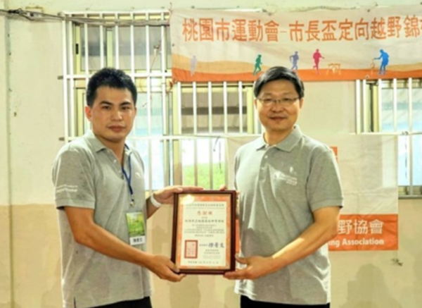 桃園市體育總會定向越野委員會總幹事陳彥文頒贈感謝狀感謝桃園高中徐宗盛校長提供優質場地辦理比賽。
